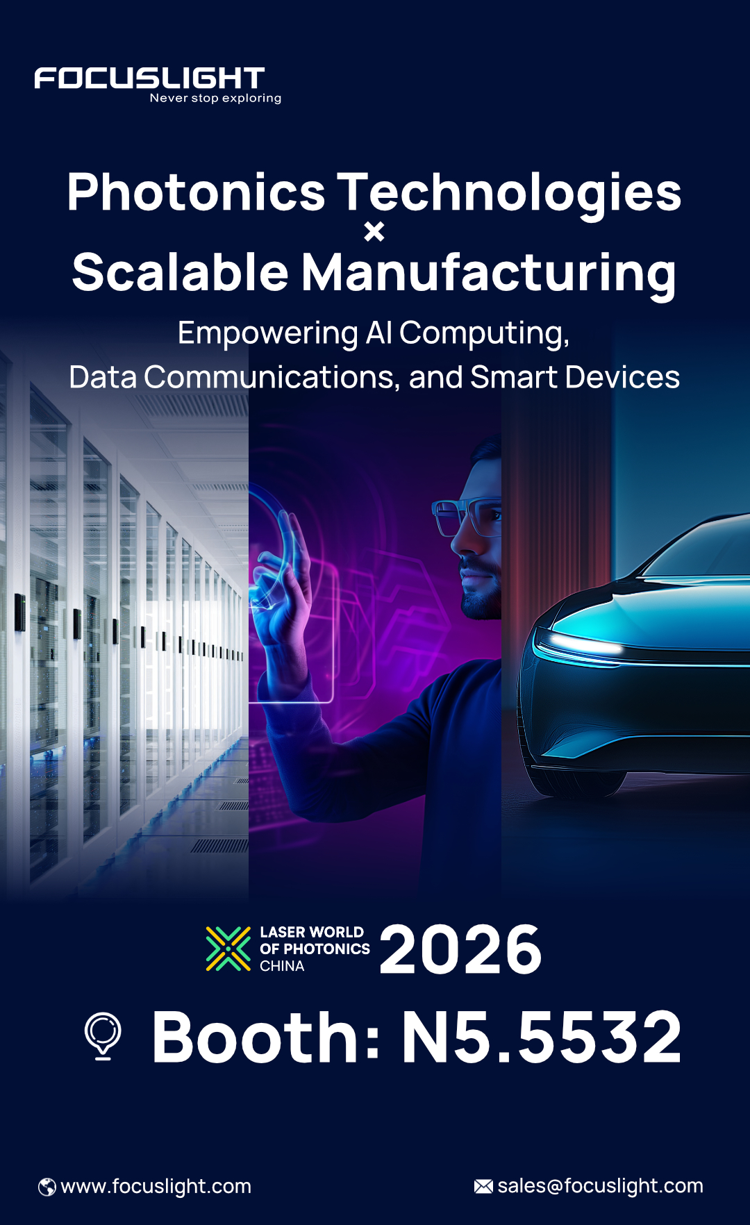 - Booth N5.5532 – themed “Photonics Technology × Scalable Manufacturing: Empowering AI Computing, Data Communications and Smart Devices” – will emphasize our “co-design” concept and global manufacturing capabilities, presenting innovative solutions tailored for high-volume scenarios in optical communications, consumer electronics, and automotive applications.