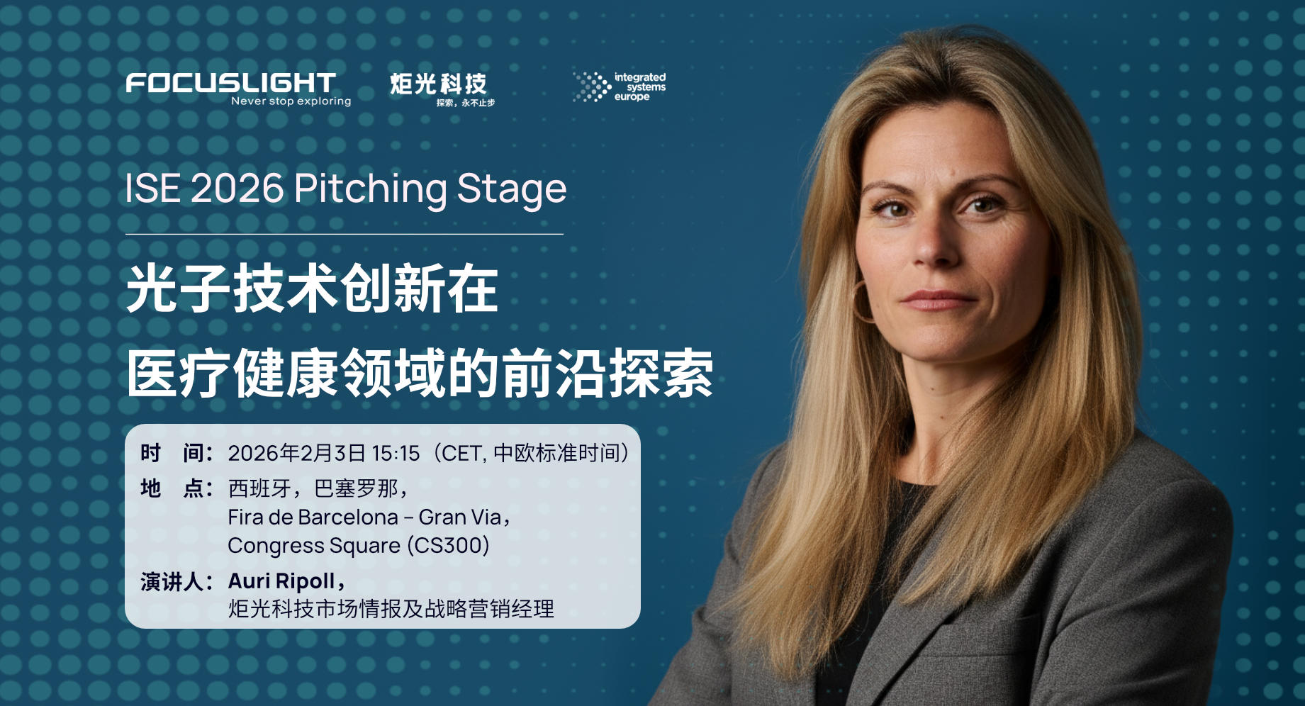 2026 年 2 月 3 日(周二)当地时间 15:15,炬光科技市场分析与战略市场经理 Auri Ripoll 将出席在西班牙巴塞罗那Fira de Barcelona – Gran Via展馆举行的 Integrated Systems Europe (ISE) 2026 Pitching Stage技术报告专场并发表专题报告,题为 《Light-Based Innovation: Discovering the Role of Photonics in Healthcare》(光子技术创新在医疗健康领域的前沿探索)。本次报告将深入探讨光子技术如何重塑现代医疗应用,并持续改善患者治疗效果与健康管理水平。
